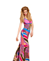 Long printed dress with thin adjustable straps. V-neckline and wiring under the bust with ruffles at the bottom of the dress.